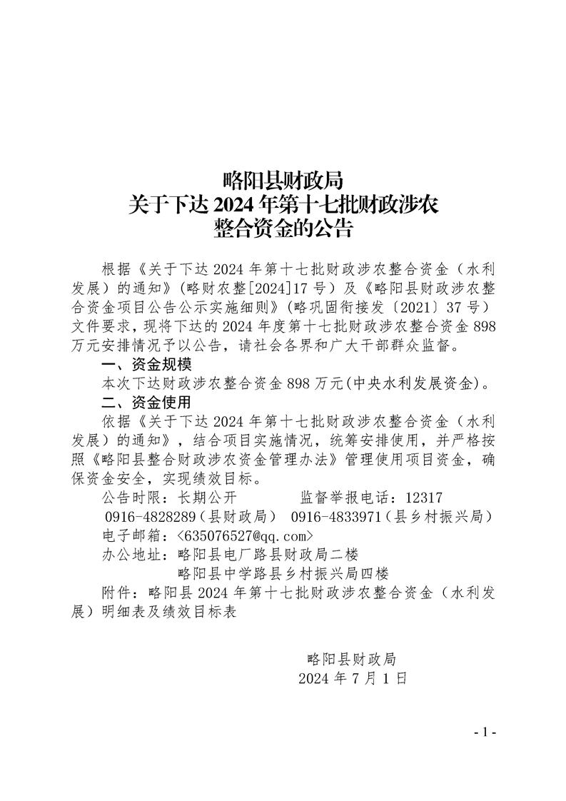 略陽縣財政局關于下達2024年第十七批整合財政涉農(nóng)資金的公告