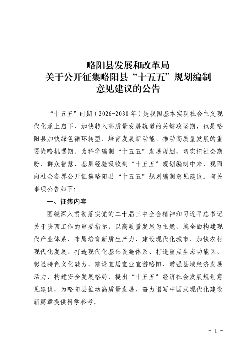 略陽縣發(fā)展和改革局關(guān)于公開征集略陽縣“十五五”規(guī)劃編制意見建議的公告