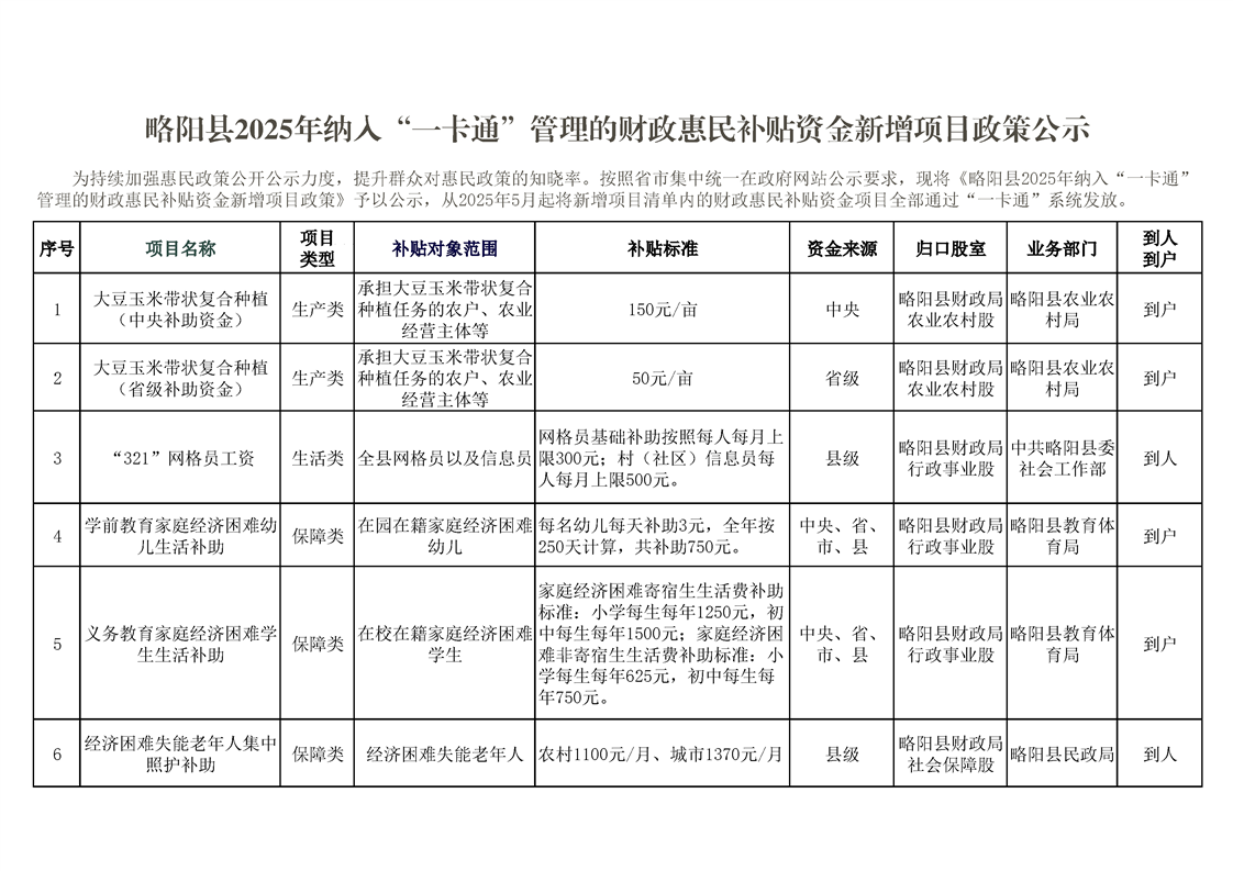 略陽縣2025年納入“一卡通”管理的財政惠民補貼資金新增項目政策公示 |