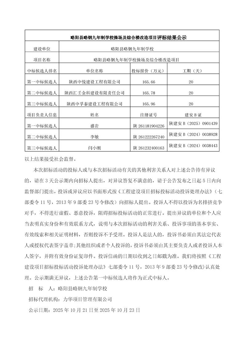 略陽縣略鋼九年制學校操場及綜合樓改造項目評標結果公示