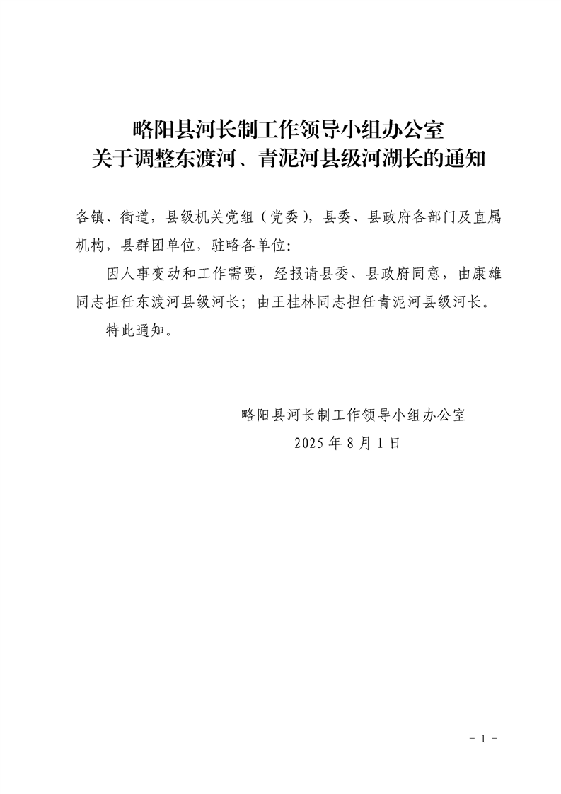 略陽縣河長制工作領導小組辦公室關于調整東渡河、青泥河縣級河湖長的通知
