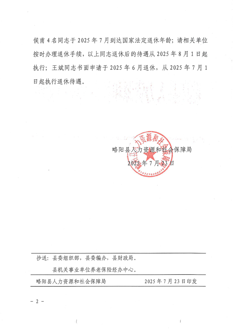 略陽縣人力資源和社會保障局關于任文華等5名同志退休的通知