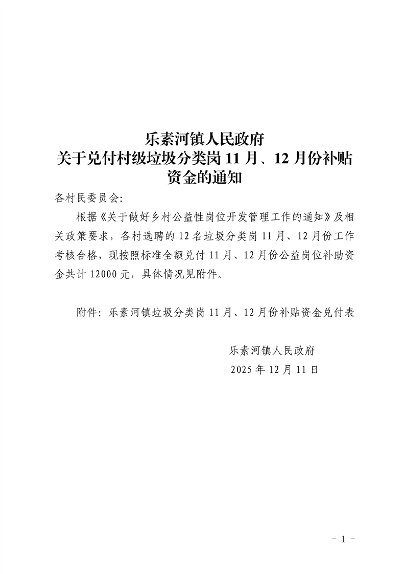 樂素河鎮人民政府關于兌付村級垃圾分類崗11月、12月份補貼資金的通知