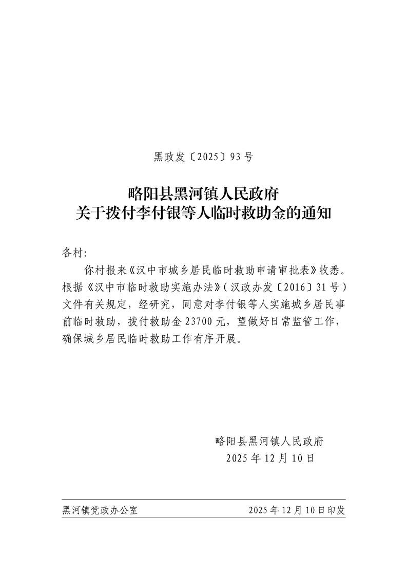 略陽縣黑河鎮人民政府關于撥付李付銀等人臨時救助金的通知