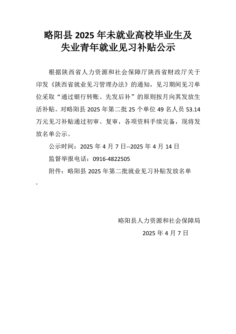 略陽(yáng)縣2025年未就業(yè)高校畢業(yè)生及失業(yè)青年就業(yè)見(jiàn)習(xí)補(bǔ)貼公示
