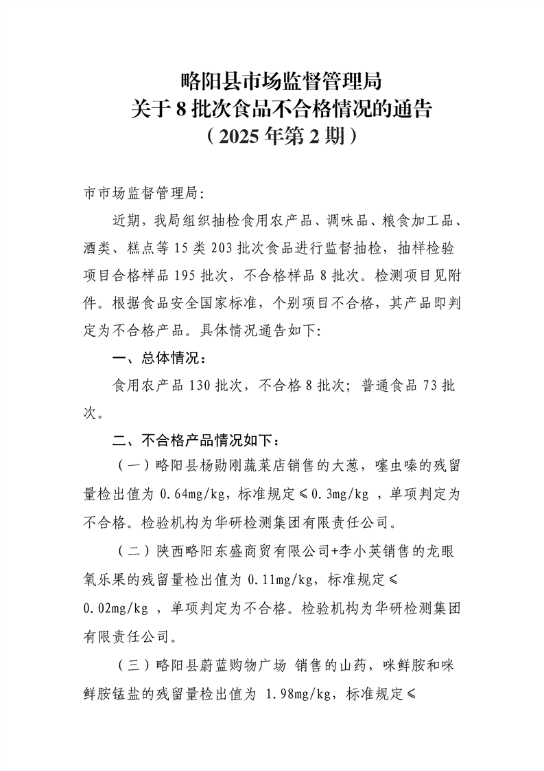 略陽縣市場監督管理局食品安全抽檢信息不合格通告(2025年第2期)