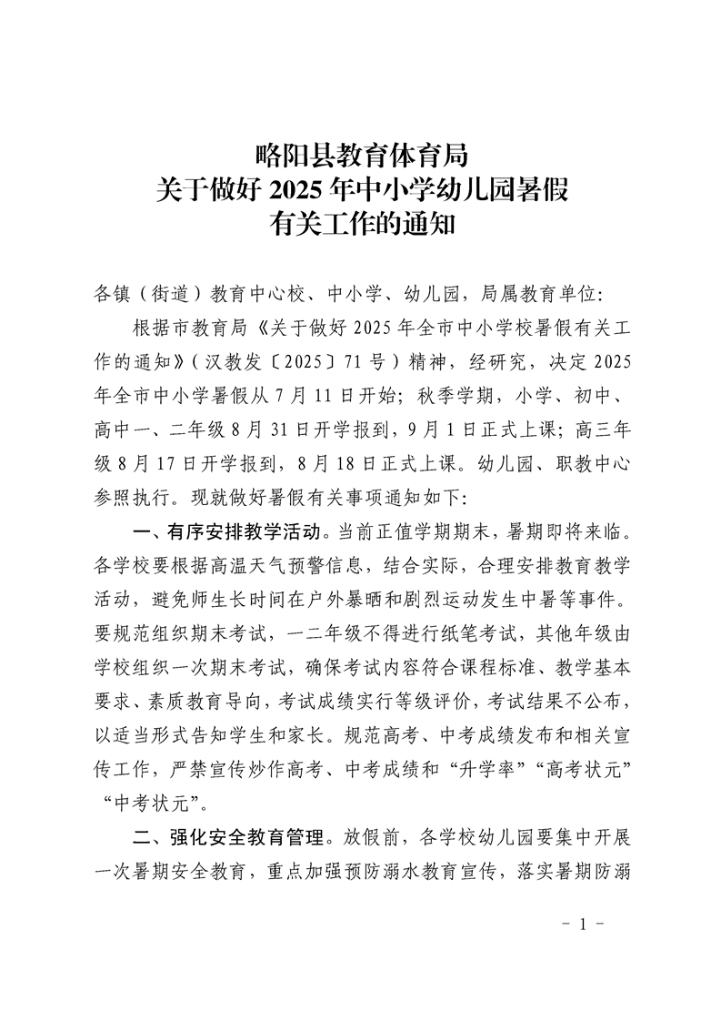 略陽(yáng)縣教育體育局關(guān)于做好2025年中小學(xué)幼兒園暑假有關(guān)工作的通知_