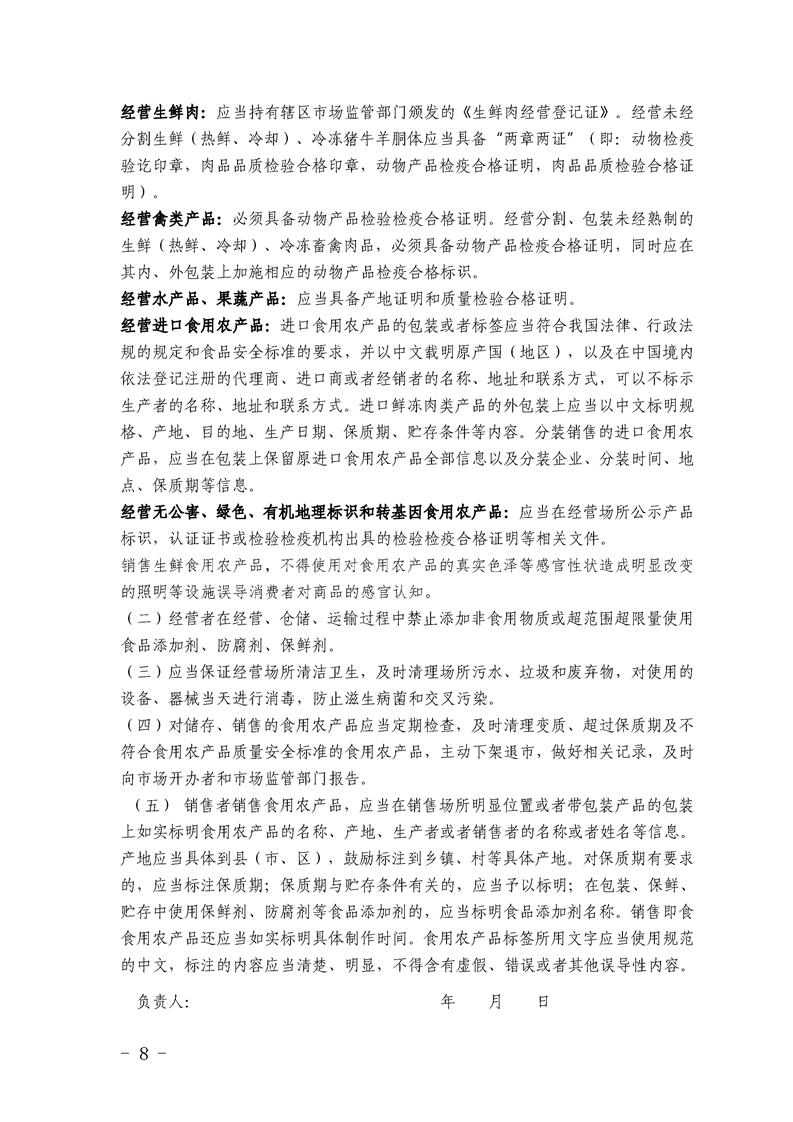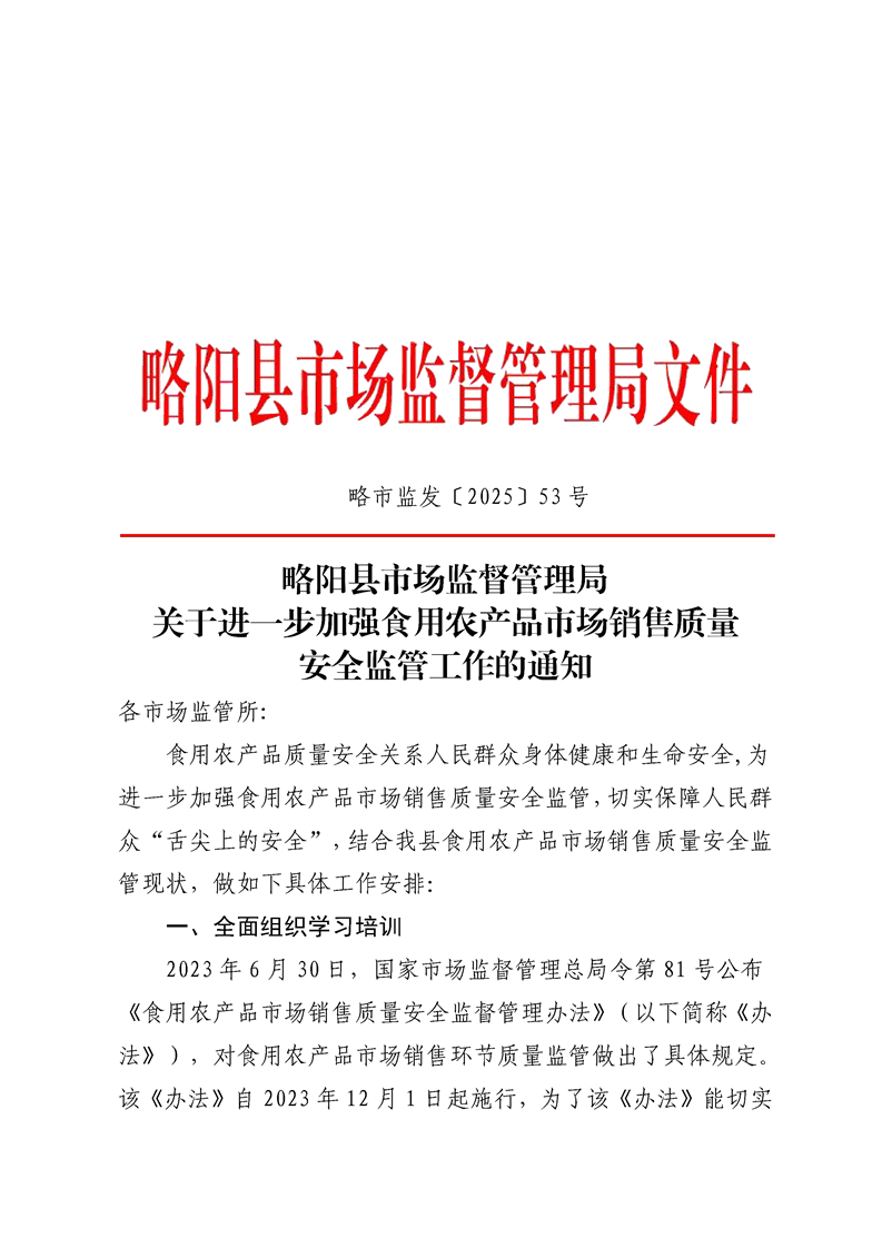 略陽縣市場監督管理局關于進一步加強食用農產品市場銷售質量安全監管工作的通知