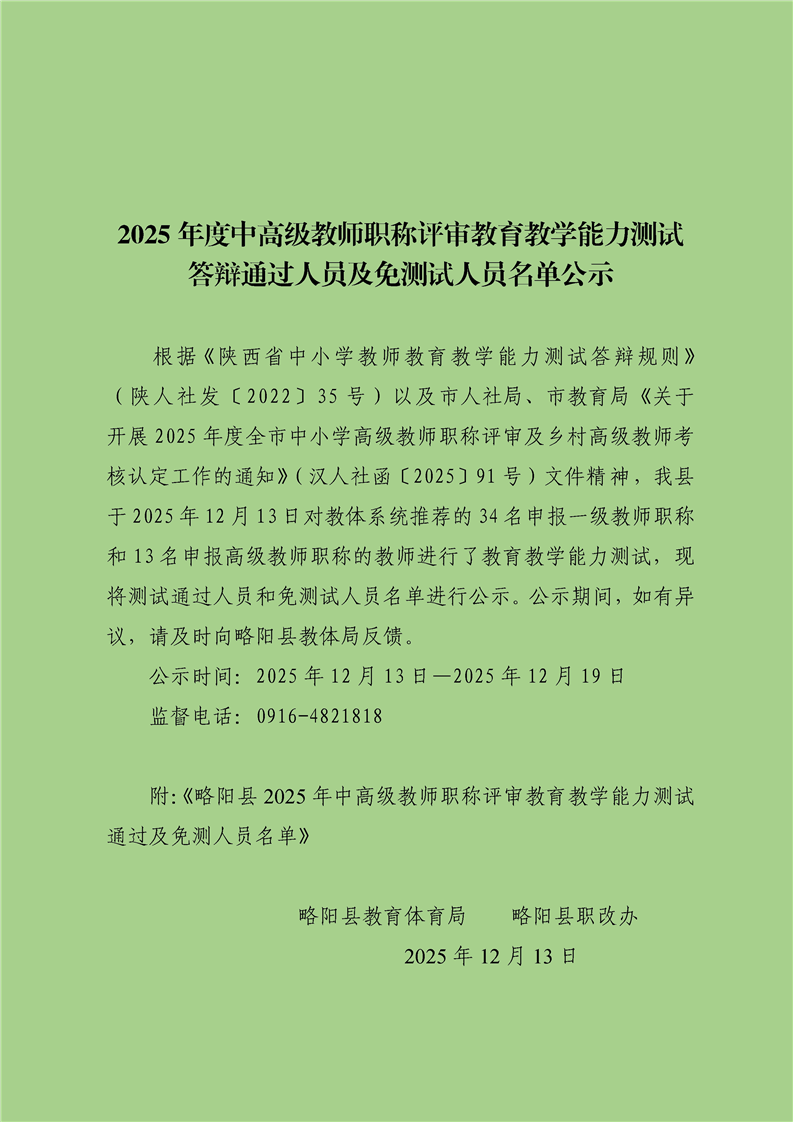 略陽縣2025年中高級教師職稱評審教育教學能力測試通過及免測試人員名單