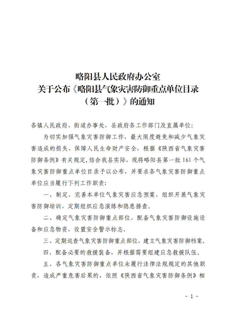 略陽縣人民政府辦公室關(guān)于公布《略陽縣氣象災(zāi)害防御重點(diǎn)單位目錄(第一批)》的通知