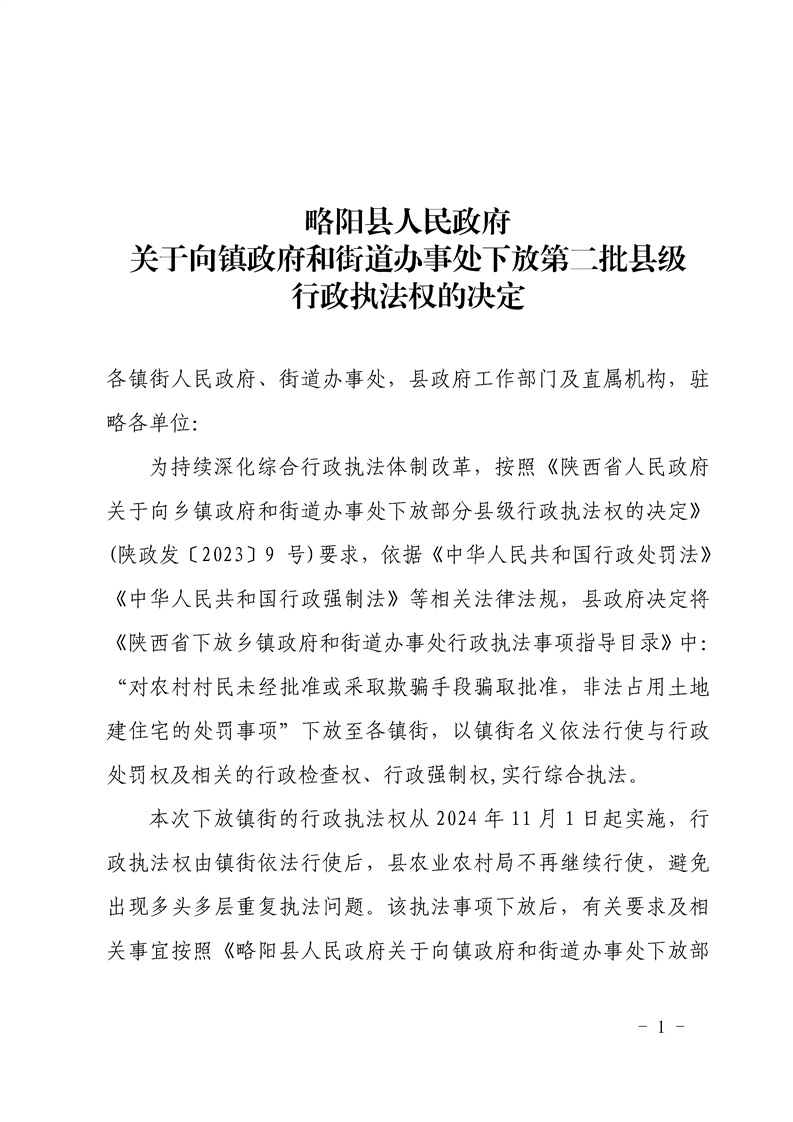 略陽縣人民政府關于向鎮政府和街道辦事處下放第二批縣級行政執法權的決定 |