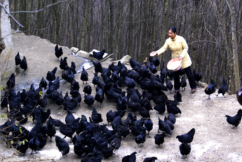 略陽烏雞獨特之處,除與種質(zhì)遺傳因素直接相關(guān)外,還與獨特飼養(yǎng)管理方式密不可分。略陽烏雞以其覓食力強(qiáng)、食性雜、野性強(qiáng)的生物學(xué)特性形成了最適宜采用生態(tài)放養(yǎng)的飼養(yǎng)方式,即白天讓雞在放養(yǎng)場地自由采食野草、蟲子等天然飼料(每畝放養(yǎng)密度不超過200只),早晚(早上放養(yǎng)前,晚上歸牧?xí)r)補(bǔ)充飼喂少量當(dāng)?shù)卦Z(玉米、小麥、稻谷及雜糧)和青綠飼料。飼養(yǎng)周期長,最早出欄上市時間為6個月齡(公、母雞體重分別不低于2公斤和1.7公斤)。略陽當(dāng)?shù)氐酿B(yǎng)殖戶還編出這樣一段順口溜“略陽烏雞、山坡散養(yǎng)。自食蟲草,只喂原糧。藥食兼用,肉質(zhì)優(yōu)良。”